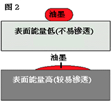 如果油墨的張力比物件大,油墨就不能貼服于物件表面。要改善此情況,物件需預先經其他方法處理。所以要油墨有效地黏貼于物件上,油墨的張力必需比物件的表面能量低(圖2)。當物件表面有油脂,塵?;蚱渌砑游锏?,均需預先清潔以確保最佳的上色效果。
